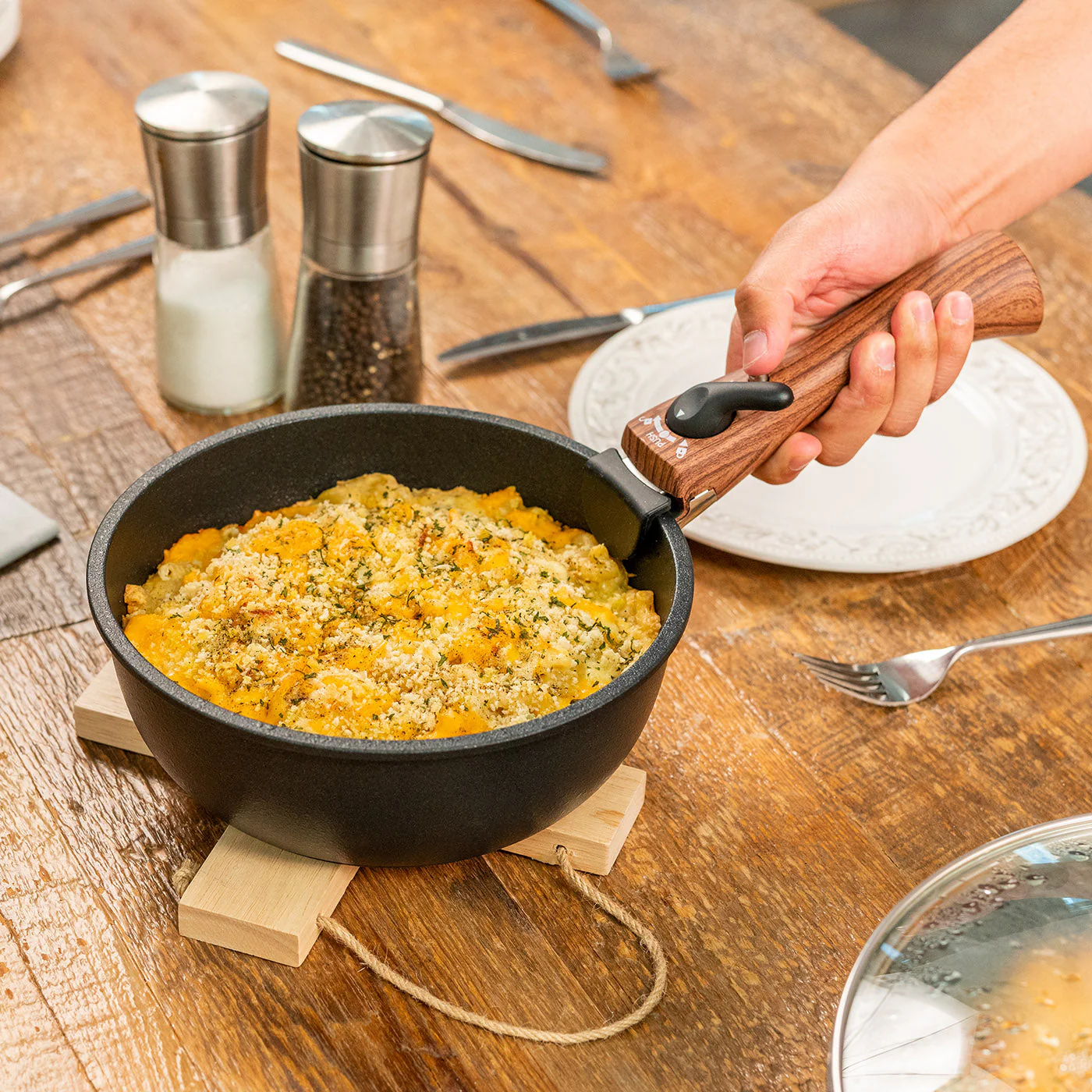 - SPACE SAVING TRIVET: Raise your skillets off from the table by using the included wooden trivet. Lock the two woods together to use it, and stack or hang when not in use.